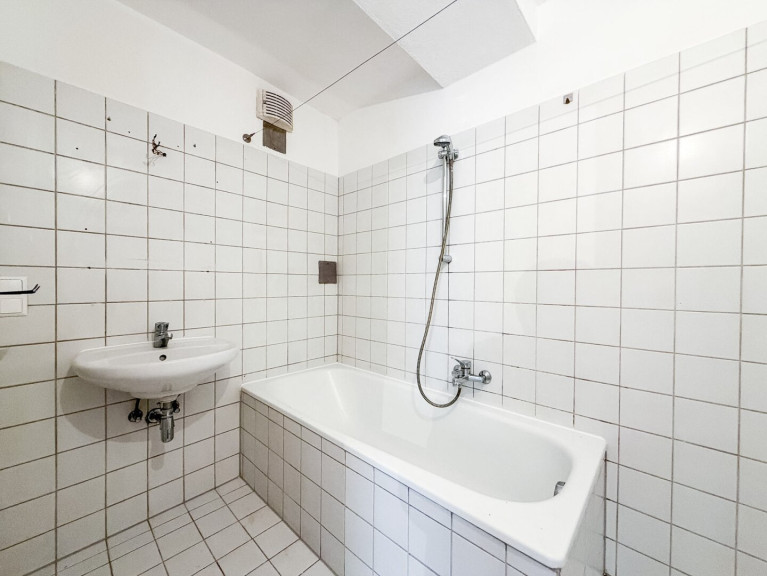 Vom Vorraum gelangt man in das Badezimmer mit Badewanne und Waschmaschinenanschluss, in das separat begehbare WC und in den Wohn-/Essraum inkl. Küchenbereich, welcher über zwei Fenster mit Blick in Richtung Innenhof verfügt und an das auch das Schlafzimmer angeschlossen ist.