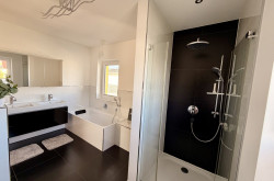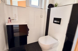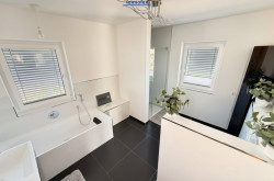 - Für Gäste bietet sich das separate WC der Marke Toto im Erdgeschoss an, die heimelige Atmosphäre bietet im Obergeschoss das Holter Bad mit Dusche und Wanne (Marke Bette) und zweitem Toto WC. Angefertigt in moderner und filigraner Optik mit 2 Fenstern, steht hier auch ein Sprinz Spiegelschrank zur Verfügung, mit Doppelwaschbecken aus Emaille. Hier lässt es sich wunderbar relaxen und eine private Auszeit genießen! Ein weiterer Teil der Badmöbel kommt aus Bella Italia.... Genießen Sie ein entspanntes Vollbad mit Blick in die Sterne!