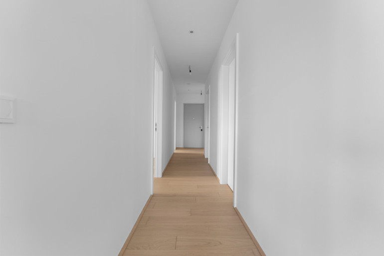 - Edle Materialien: Hochwertige Eichenparkettböden in Wohnbereichen, Gängen und Küchen sowie großformatiges Feinsteinzeug in den Nassräumen.