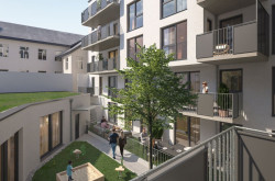 Die Beheizung und Kühlung erfolgen über ein nachhaltiges Energiekonzept mit Wärmepumpe, Erdwärmesonden und Bauteilaktivierung. Begrünte Innenhofbereiche, Fassaden- und Dachflächen schaffen ein angenehmes Mikroklima und erhöhen die Aufenthaltsqualität.
