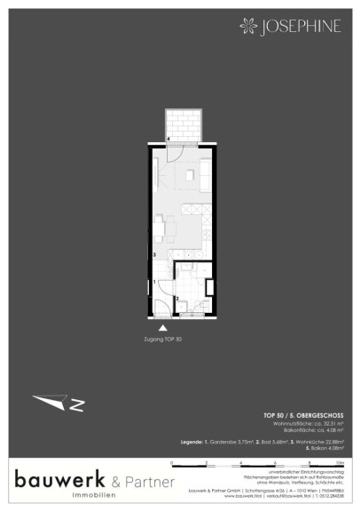 Das Wohnprojekt JOSEPHINE zeichnet sich durch seine exzellente Lage aus. in 5 Gehminuten erreichen Sie den Bahnhof Praterstern mit vielseitigen Verkehrsanbindungen. Die U-Bahn Linien U1 und U2 bieten schnelle Verbindungen in ganz Wien. Die direkte Umgebung bietet mit Rad- und Spazierwegen, Grünflächen, Auenlandschaften, dem Prater, Sportvereinen, Kinderspielplätzen und Hundezonen ideale Voraussetzungen für Erholungsaktivitäten und Naherholung im Herzen Wiens. Mit ausgezeichneter Infrastruktur, hervorragender Anbindung an das öffentliche Verkehrsnetz und der grünen Oase des Praters wird höchster Wohnkomfort gewährleistet.Beschreibung der Immobilie