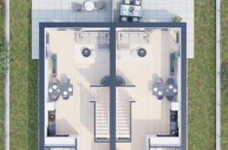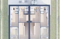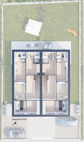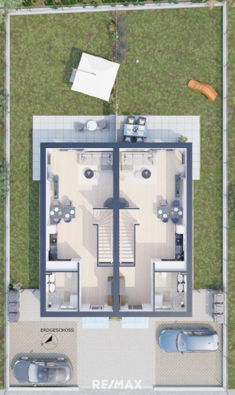 Die beiden Haushälften sind spiegelgleich konzipiert: Von der Straße aus gesehen umfasst das Haus 13a die linke Hälfte des Doppelhauses, Haus 13b die rechte Hälfte. Im Vorgarten sind pro Haus jeweils 2 Kfz-Stellplätze zugeordnet. Das Haus 13b (rechts) ist bereits verkauft.