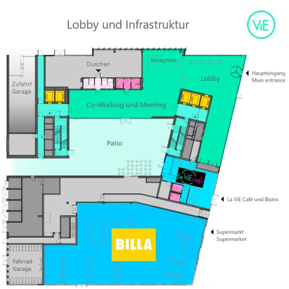 Der Standort bietet optimale Verkehrsanbindung sowohl mit öffentlichen Verkehrsmitteln (5 Min. Fußweg zur U3 Station Kardinal-Nagl-Platz) und dem eigenen PKW (13 Min. bis zum Flughafen Wien und zur Innenstadt 9 Min.). Am Donaukanalradweg erreicht man mit dem Fahrrad die Innenstadt in nur 8 Min. Für Sportler bietet das ViE neben Duschen und Garderoben im EG auch einen sicheren Abstellplatz für Fahrräder. Öffentlicher Verkehr: - U-Bahn: U3 Station Rochusgasse - Bus: 4A - Straßenbahn: 1, 18 Infrastruktur - Direkter Verbindungssteg in den Prater über den Donaukanal - Anbindung Flughafen über Nebenfahrbahn direkt zu A4 - Kindergarten am Areal - Kantine am Areal - Fahrradweg Donaukanal und Prater - Supermarkt im Gebäude - Fitnesscenter FITINN am ArealBeschreibung der Immobilie