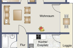 Die Eigentumswohnung ist aufgeteilt in einen Wohnraum mit angrenzender Küche und Zugang zur Loggia, zwei Schlafzimmer, ein Badezimmer mit Wanne und ein Gäste-WC.