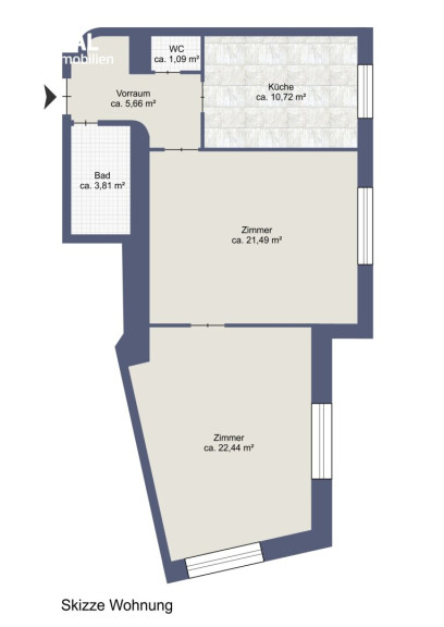 Ein Wohnzimmer, ein Schlafzimmer, eine getrennte Tageslichtküche, ein Badezimmer mit Dusche sowie ein getrenntes WC.