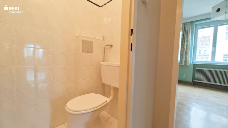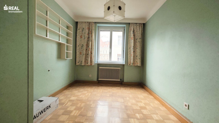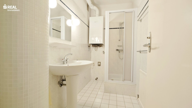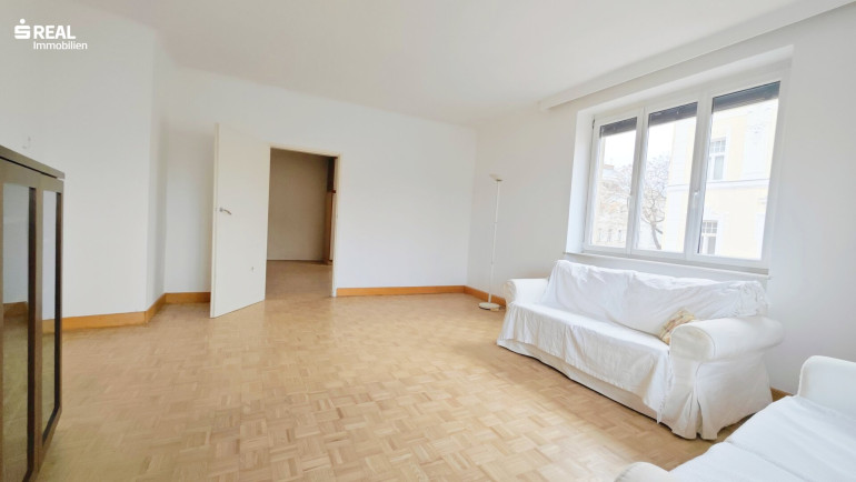 Die Wohnung befindet sich zwar nicht in einem neu sanierten Zustand, überzeugt jedoch durch ihren gepflegten Charakter. Klassische Parkettböden verleihen den Wohnräumen Wärme und Wohnlichkeit, die Nassräume sind zeitlos verfliest.