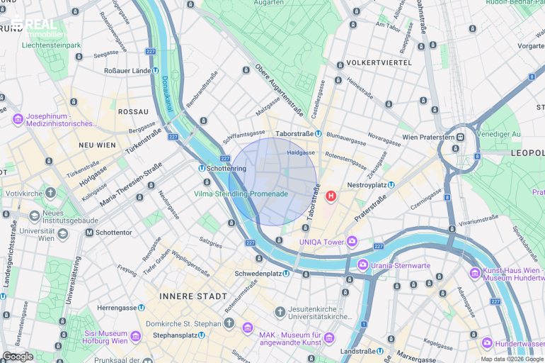 Ein besonderes Highlight ist die Lage: Die Wohnung überblickt den Karmelitermarkt und genießt angenehme Nachmittagssonne. Der Markt selbst ist weit mehr als nur ein Nahversorger – er ist Treffpunkt, Lebensraum und Herzstück des Viertels. Regionale Produzenten, kleine Feinkoststände, Cafés und internationale Lokale prägen das Bild und verleihen der Gegend ihre unverwechselbare Atmosphäre. Der nahegelegene Augarten sowie der Donaukanal bieten zusätzlichen Erholungsraum im Grünen.