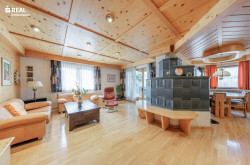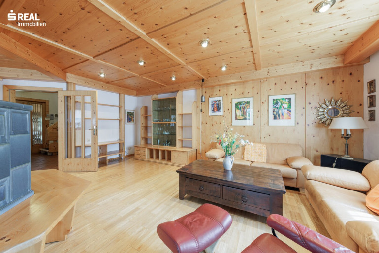 Im Mittelpunkt des Hauses steht das helle Wohn-Esszimmer mit Blickfang auf den wunderschönen Kachelofen. Dieser sorgt für behagliche Wärme und schafft eine besonders gemütliche Wohnatmosphäre.