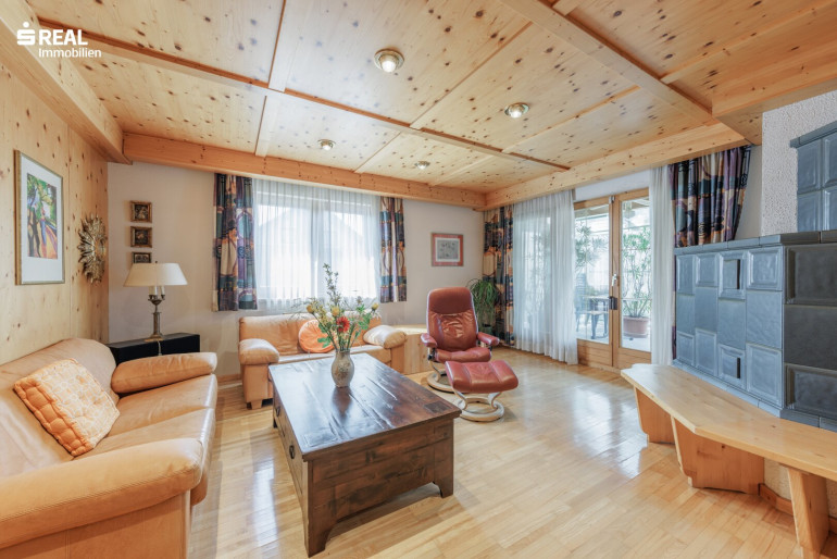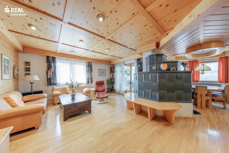 - Wohn-Esszimmer mit wunderschönem Kachelofen, der eine besondere Gemütlichkeit zaubert