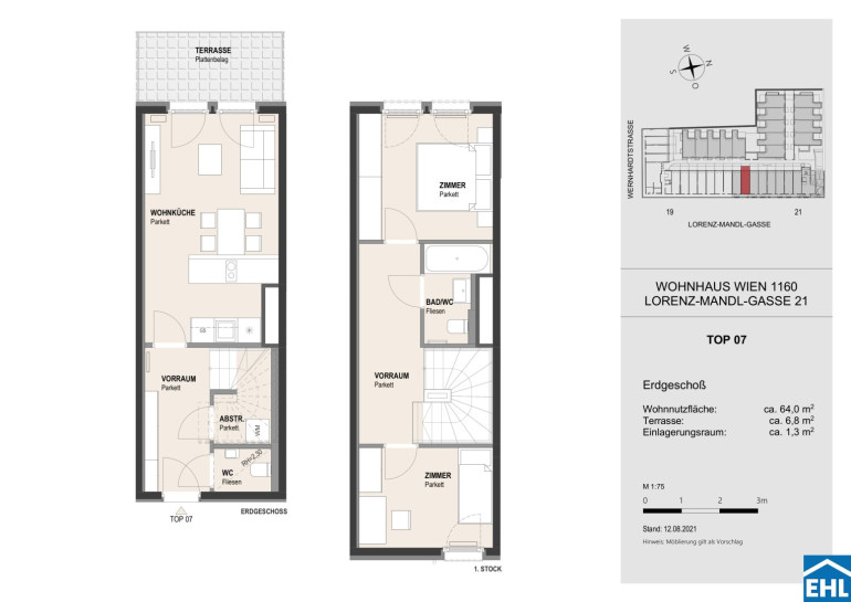 Die Wohnung befindet sich im Erdgeschoss und verfügt über einen großzügigen Wohnraum mit voll ausgestatteter Küche, zwei Schlafzimmer, ein Badezimmer mit Badewanne, WC und Waschmaschinenanschluss, ein Gäste WC sowie einen Vorraum und eine Terrasse.