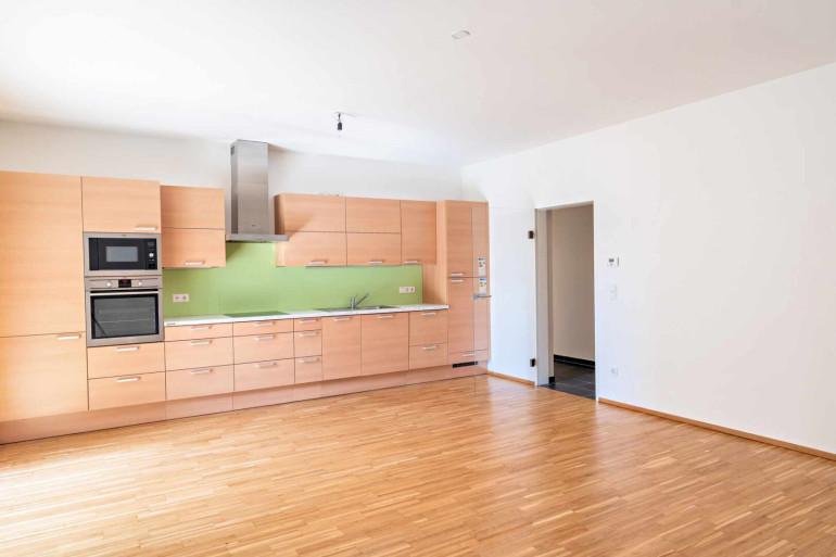 Der Wohnbereich präsentiert sich als offen gestalteter Lebensraum, in dem Kochen, Essen und Wohnen nahtlos ineinander übergehen. Die Raumstruktur wirkt einladend und gemütlich, wodurch sich schnell ein angenehmes Wohngefühl einstellt. Der direkte Zugang zur Terrasse verbindet den Innenraum mit dem Außenbereich und erweitert den Wohnraum auf natürliche Weise. Die integrierte Einbauküche fügt sich harmonisch in das Gesamtbild ein und bietet praktische Funktionalität für den Alltag.