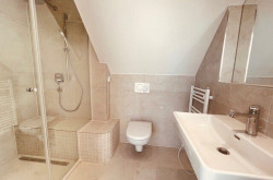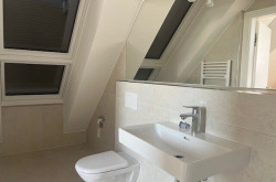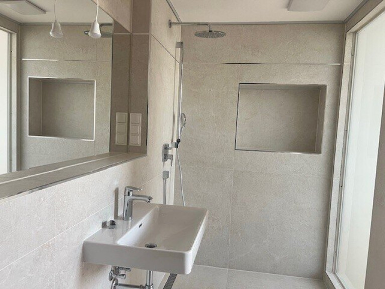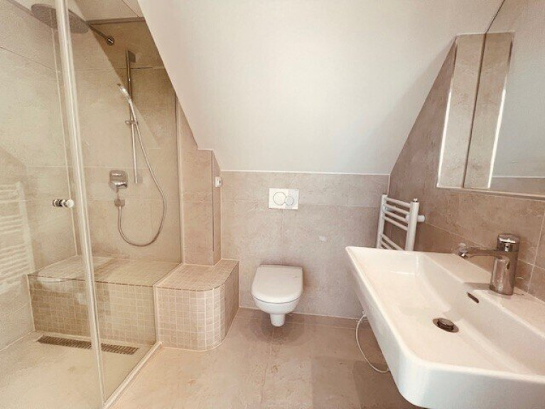 Die Wohnfläche befindet sich auf einer Ebene und verfügt die Wohnung über ein großzügiges rd. 25m² Schlafzimmer mit ensuite-Badezimmer mit Fenster, ein 2.Schlafzimmer mit eigenem Dusch/WC, einem hellen Vorraum mit Verglasung, sowie einen Abstellraum und ein separates WC mit Handwaschbecken.