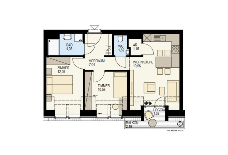 Perfekter 3-Zimmer-Grundriss auf wenig m² und trotzdem viel Platz bietet diese gassenseitige und nach Süden gerichtete Wohnung im 1.Dachgeschoss. Eine helle Wohnküche mit Ausgang auf die rd. 3,80m² südseitige Freifläche. 2 gräumige Schlafzimmer, ein Duschbad mit WM-Anschluss, ein saparates WC mit Handwaschbecken im Vorraum und ein Abstellraum umfassen das Raumangebot.