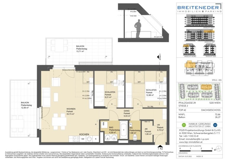 Dieses moderne Wohnprojekt in der Pfalzgasse 29, im 22. Wiener Gemeindebezirk, zeichnet sich durch seine hochwertige Ausstattung, ideale Lage und exzellente Anbindung aus, wodurch es den perfekten Rahmen für zeitgemäßes Wohnen und Arbeiten bietet.