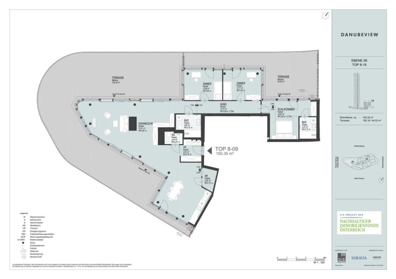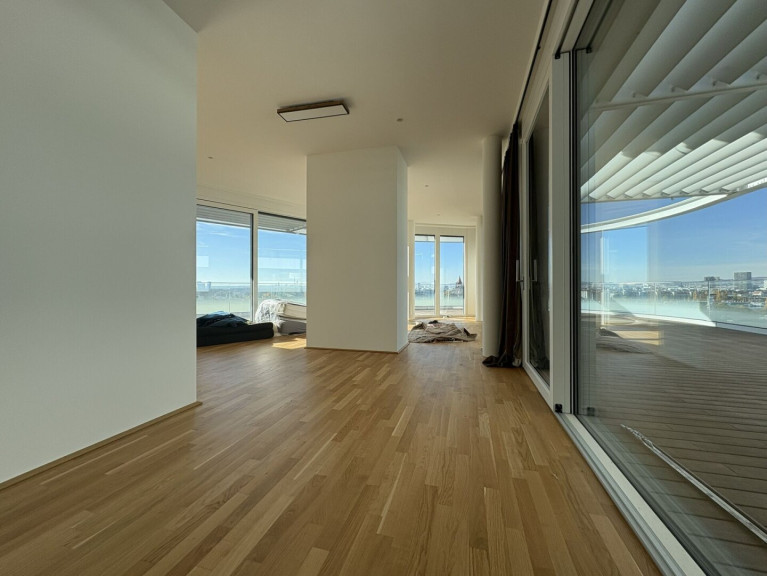 DANUBEVIEW umfasst insgesamt 159 Mietwohnungen mit Größen zwischen 30 m² und 150 m², verteilt auf 1 bis 4 Zimmer. Großzügige Grundrisse und lichtdurchflutete Räume mit weitläufigen Fensterfronten eröffnen atemberaubende Ausblicke auf die Donau und die City.