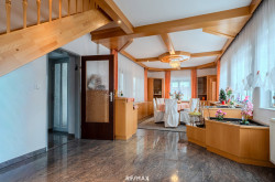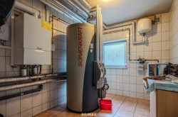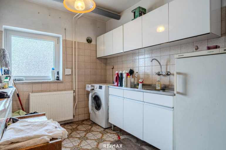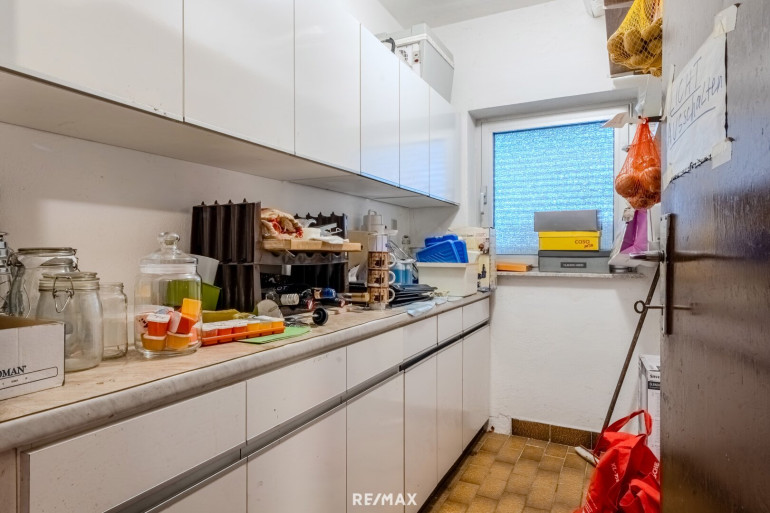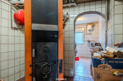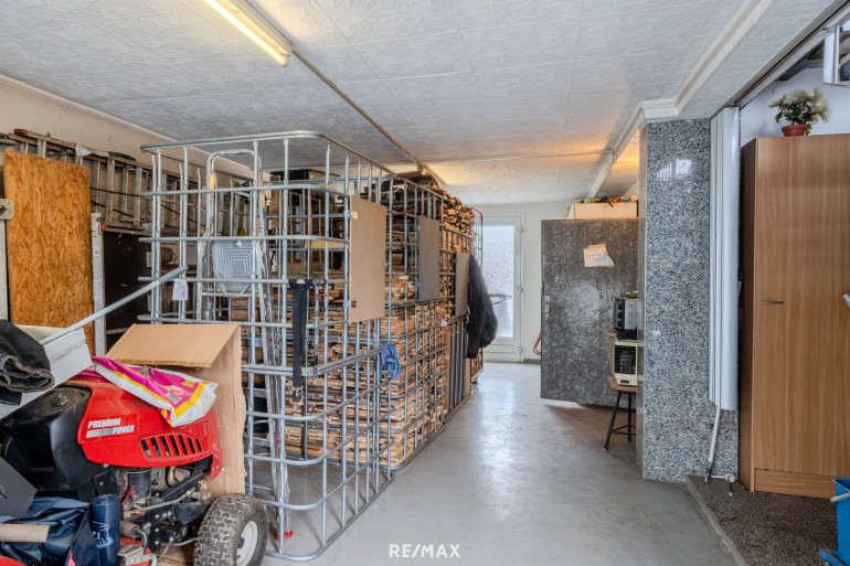 Im Untergeschoss befinden sich mehrere funktionale Nebenräume, darunter ein großzügiger Geräteraum, Abstellräume, eine Waschküche sowie ein Heizraum mit kombinierter Öl- und Festbrennstoffheizung. Ergänzt wird diese Ebene durch eine große Garage sowie weitere Kellerräume, die vielfältige Nutzungsmöglichkeiten bieten.