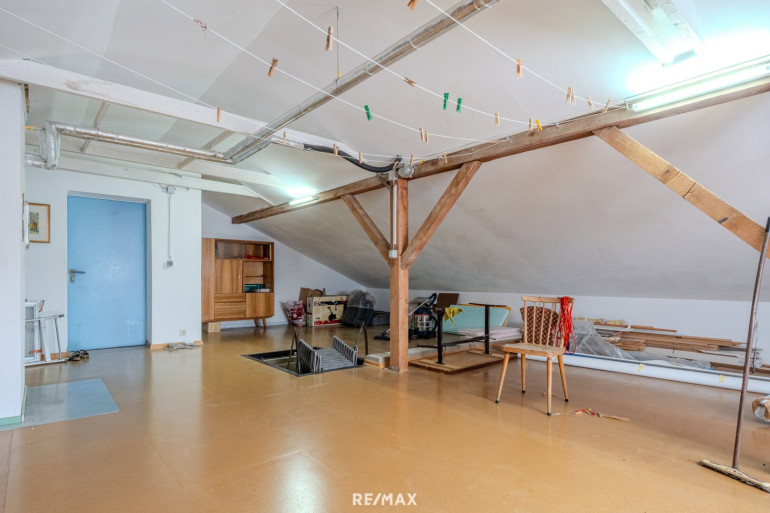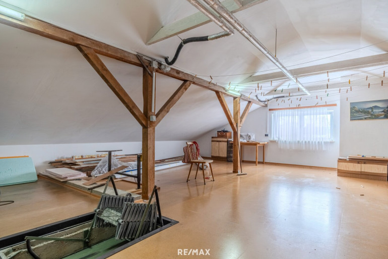 Über einen Aufgang gelangt man in das Dachgeschoss, welches ein bereits ausgebautes, großzügiges Zimmer bietet. Darüber hinaus steht ein weiterer Dachbodenbereich zur Verfügung, der zusätzliches Ausbaupotenzial eröffnet und somit Raum für individuelle Wohnideen schafft.