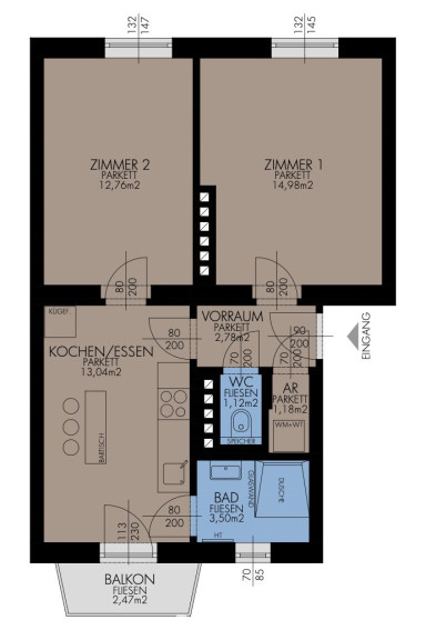 - großzügige, neue Markenküche (inkl. Geräte) mit Essbereich und Zugang zum Balkon