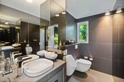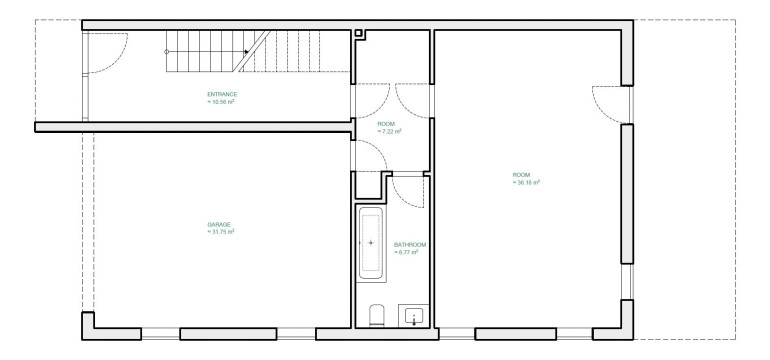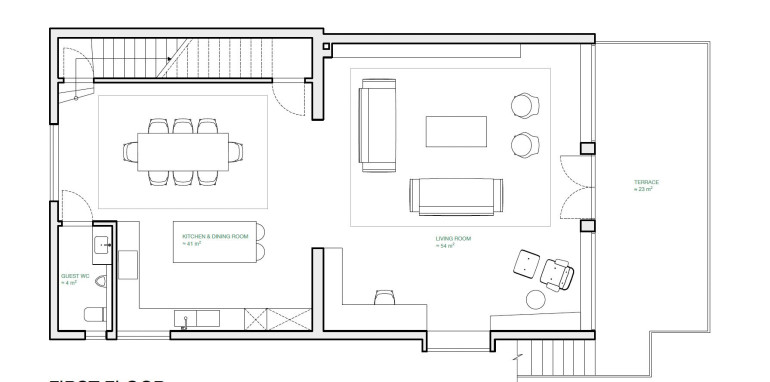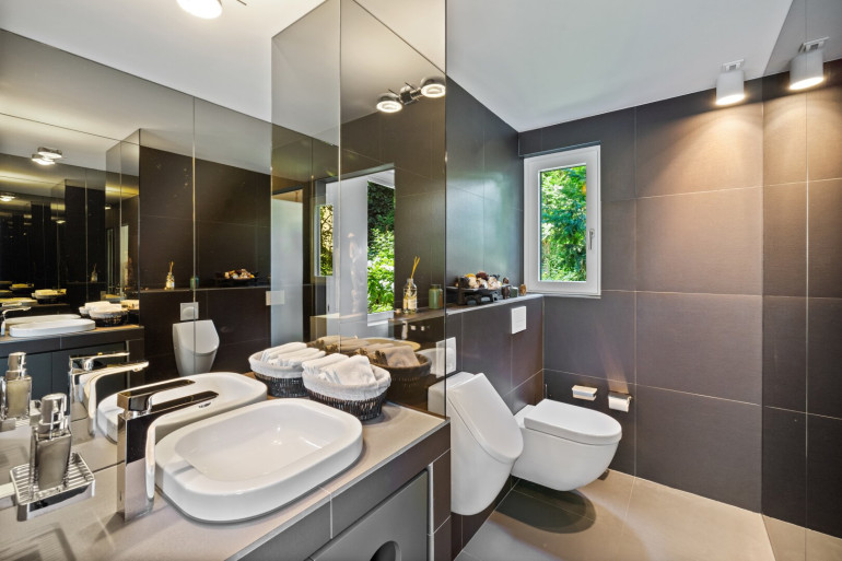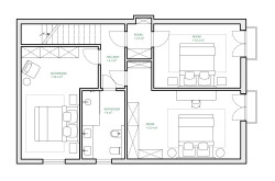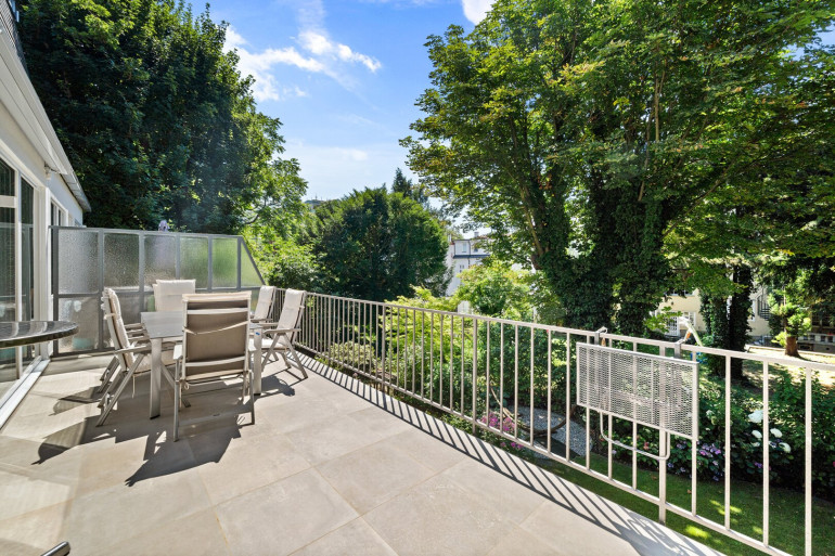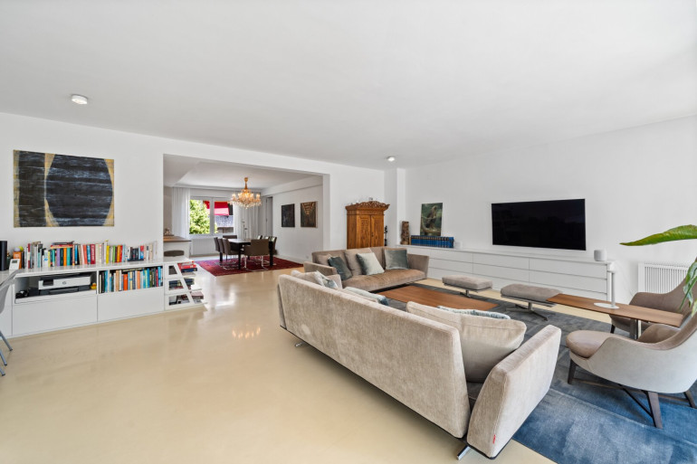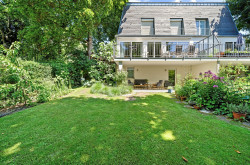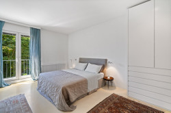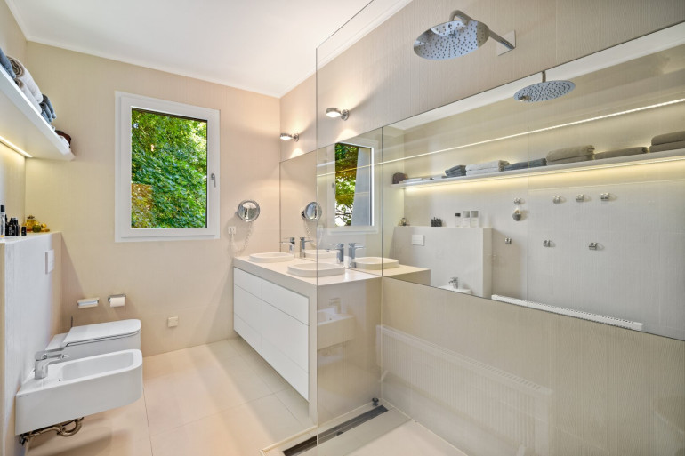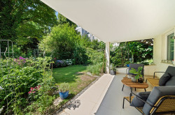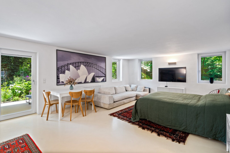 Das vierte Schlafzimmer mit Bad und WC befindet sich im Erdgeschoß, vorgelagert ist eine ca. 20 m2 große Terrasse mit direktem Zugang zum Garten. Die klug konzipierten Installationen erlauben es, dass dieser Bereich auch als separate Gästewohnung genutzt werden kann.
