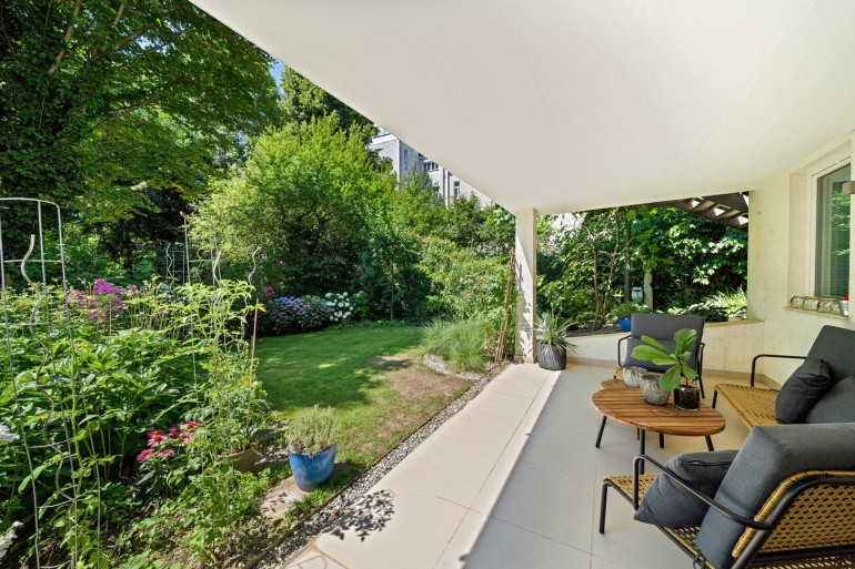Der großzügige Wohn- Essbereich mit einer modernen, offenen Küche und einem vorgelagerten 23 m2 Südbalkon mit direktem Abgang in den traumhaften Garten bildet das kommunikative Zentrum - hier findet das tägliche Familienleben statt. Die Einbauküche ist ein wahres Juwel und wird jeden begeistern, der gerne kocht. Die offene Gestaltung der Wohnküche schafft eine gemütliche Atmosphäre und ist perfekt für gesellige Abende mit Freunden und Familie. Der liebevoll gestalteten Garten (ca. 150 m2) bietet uneinsehbare Erholung im Grünen, die großen Glasfronten des Wohnzimmers und die sonnigen Außenflächen erlauben einen herrlichen Ausblick auf die angrenzenden, gepflegten Gärten.