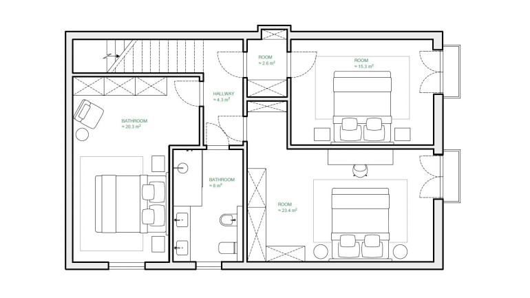 Drei der vier Schlafzimmer mit einem großen Badezimmer sind im 2. Obergeschoß situiert, hier gäbe es zudem auch die Möglichkeit, über eine noch zu errichtende Wendeltreppe auf die 84 m2 große Dachterrasse zu gelangen