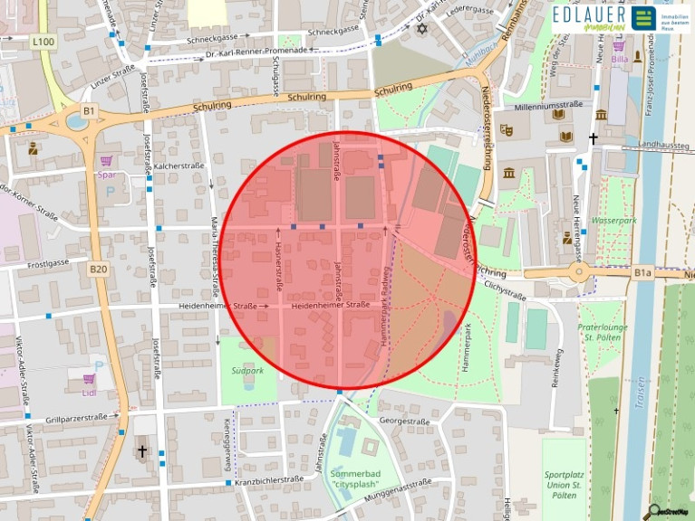Die Lage kann ohne Zweifel als hervorragend bezeichnet werden. Inmitten des Villenviertels von St. Pölten und nur einen Steinwurf vom Hammerpark entfernt bietet die Wohnung eine angenehme und ruhige Wohngegend. Auch diverse Einkaufsmöglichkeiten lassen sich in kürzester Zeit bequem mit dem Auto, Fahrrad oder auch zu Fuß erreichen. Mit dem Bus der Linie 7 ist auch der Weg zu weiter entfernten Zielen, darunter auch der Hauptbahnhof rasch bewältigt. Punkto Freizeitangebot lädt der nahegelegene Hammerpark und die Traisendämme zum Spazieren, oder das Freibad zum Schwimmen und entspannen ein.