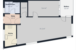 Der Grundriss überzeugt durch eine durchdachte Raumaufteilung: Über die Diele gelangt man zentral in die einzelnen Wohnbereiche. Es stehen ein großzügiger Wohn- und Essbereich mit rund 31 m², ein weiteres Zimmer mit ca. 13 m², eine separat abgetrennte Küche sowie ein Badezimmer zur Verfügung. Zusätzlich bietet ein Abstellraum praktischen Stauraum.