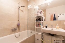 Das Badezimmer besticht durch zeitloses Design und verfügt über eine Badewanne inklusive Duschwand, Handtuchheizung, Waschbecken, Toilette und Waschmaschinenanschluss.