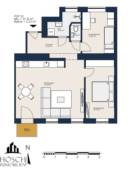 Der offene Wohn-/Essbereich mit integrierter, voll ausgestatteter Küche, bildet das Herzstück der Wohnung und bietet mit seinen ca. 32,38 m² viel Platz für gemütliche Stunden mit Familie und Freunden. Von hier aus gelangt man auf den Balkon, der eine ideale Möglichkeit bietet, den Tag mit einem Kaffee an der frischen Luft zu beginnen oder ausklingen zu lassen.