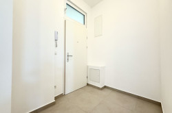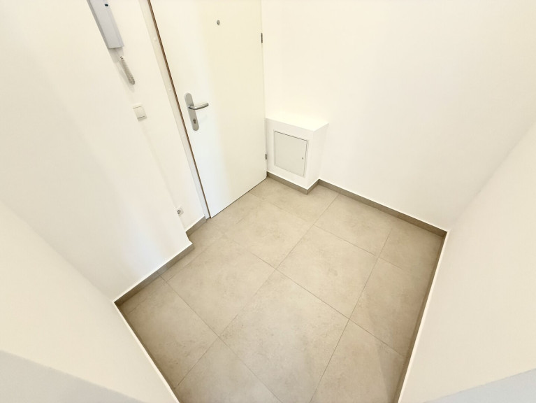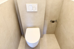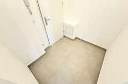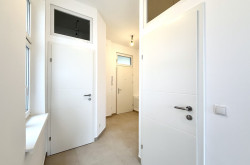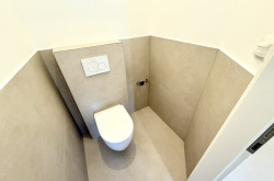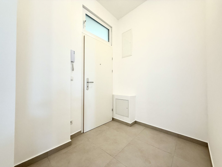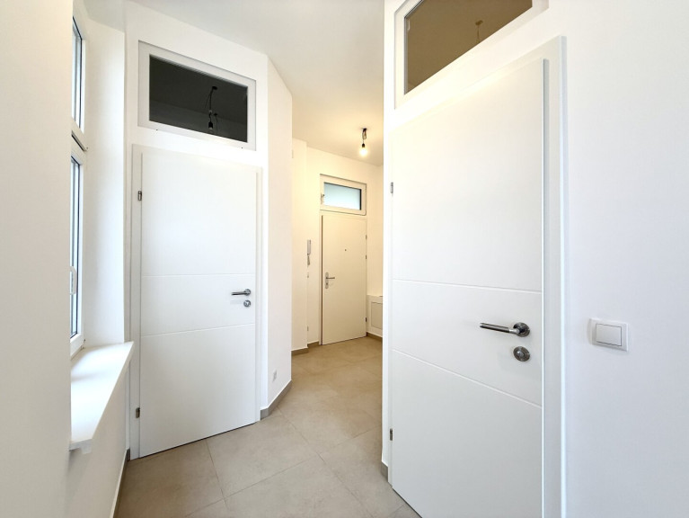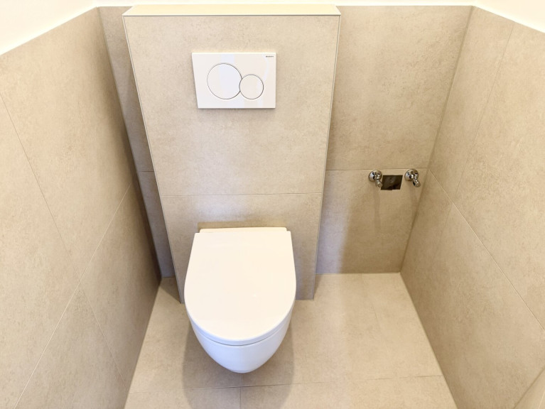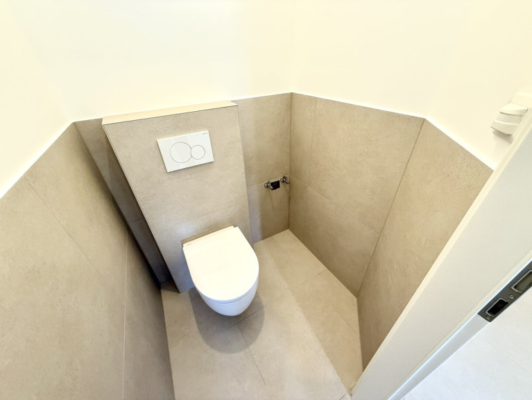 Das modern gestaltete Vorzimmer bietet ausreichend Platz für eine Garderobe und verfügt über ein Fenster zum Lichtschacht. Das separate WC ist hochwertig ausgeführt, mit Hänge-WC, zusätzlichem Wasseranschluss (z. B. für Bidet oder Waschbecken) sowie einem praktischen Bewegungssensor für die Beleuchtung ausgestattet.