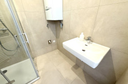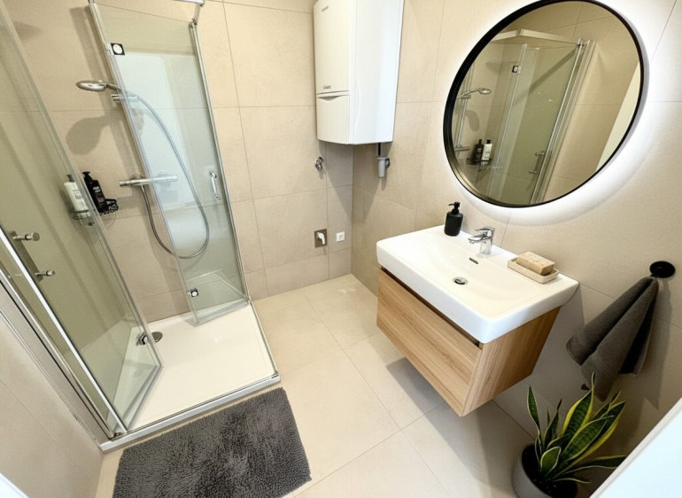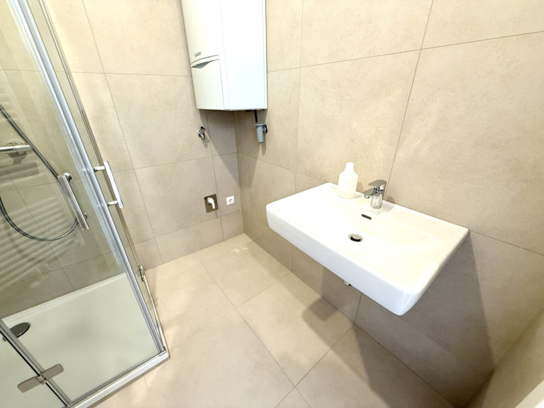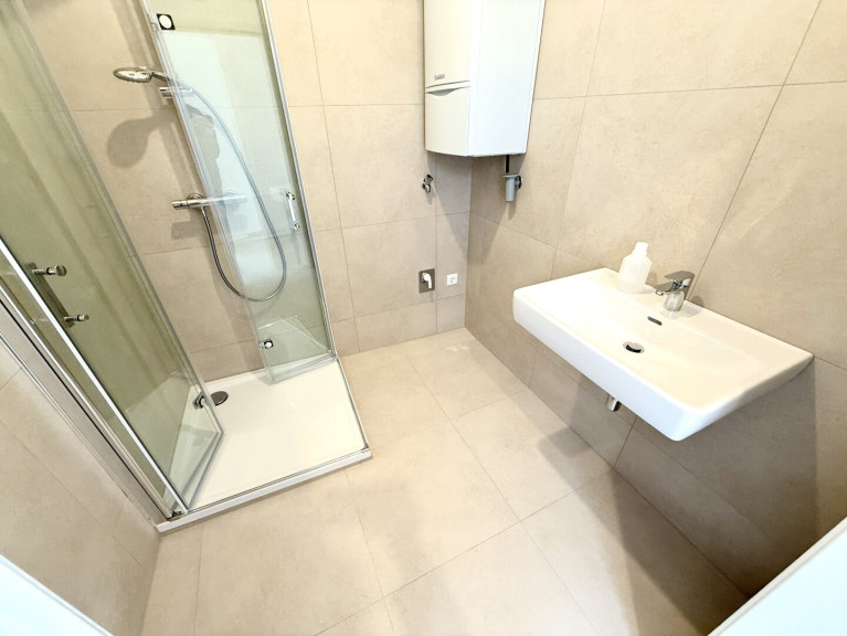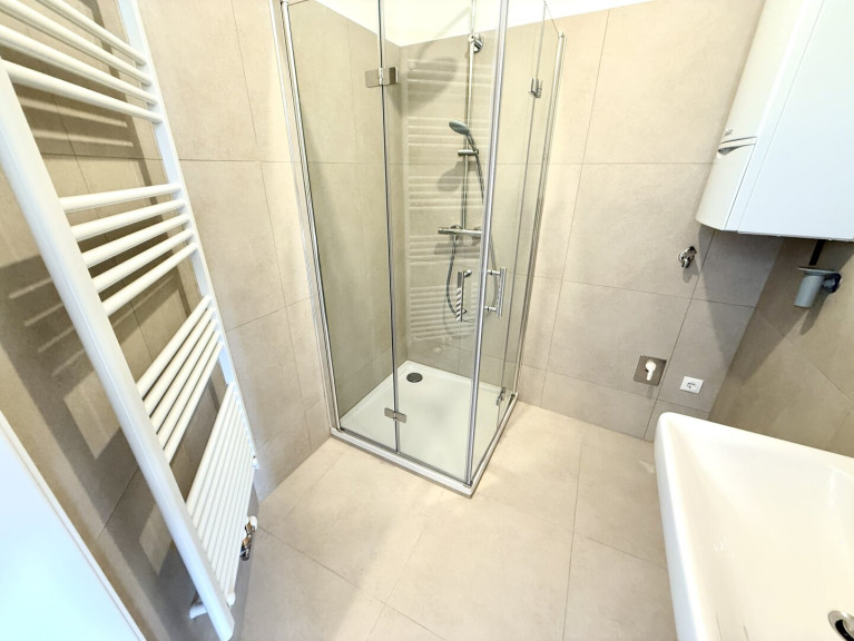 Das Badezimmer überzeugt mit einer komfortablen 90x90 cm Eckdusche, Waschbecken und Waschmaschinenanschluss. Beheizt wird die Wohnung mittels moderner Vaillant Gastherme, gesteuert über ein Raumthermostat im Wohnzimmer. Für ein besonders angenehmes Wohngefühl sorgt die in der gesamten Wohnung verlegte Fußbodenheizung.