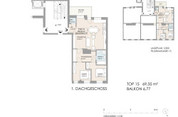 Diese Wohnung befindet sich im 1. Dachgeschoss (oft auch als oberster Liftstock bezeichnet) des Hauses in der Pilgramgasse 15 im 5. Bezirk (Margareten). Wohnfläche beträgt ca. 69,35 m², dazu ein Balkon mit ca. 6,77 m².