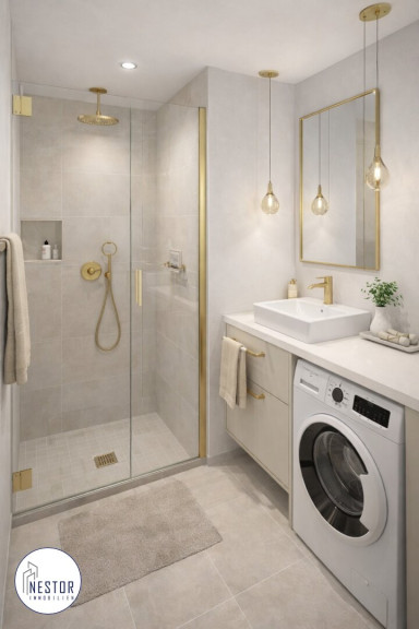 Badezimmer & WC: Modernes Bad (ca. 4,01 m²) sowie ein separates WC (ca. 1,41 m²), beide ausgestattet mit hochwertigen Sanitärobjekten.