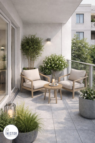 Außenflächen: Ein weitläufiger Balkon mit ca. 14,80 m², der nach Süd-Süd-West (SSW) ausgerichtet ist und einen freien Ausblick bietet.