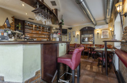 * Stehtische und Sitzplätze im Gastroraum mit Theke
