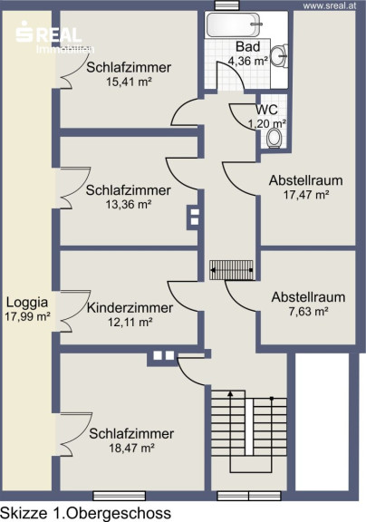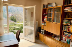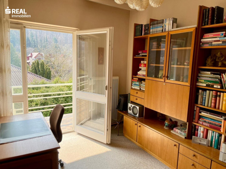 Im zentral aufgeteilten Obergeschoß befinden sich vier gemütliche Zimmer mit jeweiligem Ausgang auf die große Loggia mit südwestseitigem Traumblick auf den Wienerwald. Eines der Zimmer ist mit einer Miniküche ausgestattet. Des weiteren befindet sich auf dieser Ebene das Bad mit Fenster, ein separates WC, ein geräumiger Dachboden mit viel Stauraum und eine begehbare Garderobe.