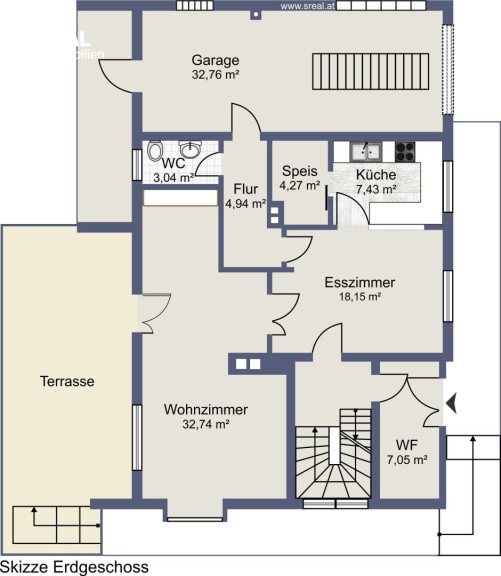 Im Erdgeschoß befinden sich ein Vorraum, ein Esszimmer mit Küche & Speis, ein geräumiges und helles Wohnzimmer mit Kamin & eigener Bar und Ausgang auf die Terrasse & den Garten, eine Gästetoilette, Flur und die Garage mit Werkbank, Montagegrube & elektrischem Tor.