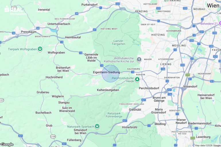 Die Liegenschaft befindet sich in einer ruhigen Gasse, jedoch unweit des Wiener Waldes, aber auch der Laaber Straße mit Anschluss an Kalksburg und zur Stadgrenze Wien.