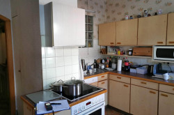 Die gerade aus zu erreichende Wohnküche ist mit einer Einbauküche eingerichtet und verfügt über einen Essplatz. Die Küche verfügt über einen Elektroherd und einen Geschirrspüler