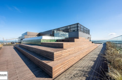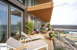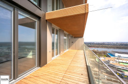 - 22m² großer Balkon mit Holzbelag und Glasgeländer
