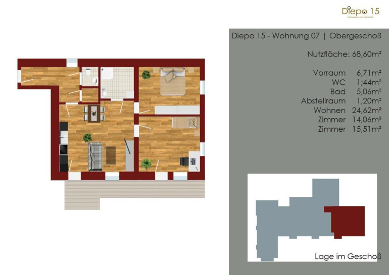 Die rd. 68 m² Wohnfläche teilen sich wie folgt auf: