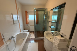 Im Obergeschoss befindet sich der großzügige Wohnbereich sowie Küche (mit Geschirrspüler und Waschmaschine), Abstellraum, Schlafzimmer und WC mit Waschtisch und Dusche. Im Untergeschoß liegt das Bad mit Wanne und Hitech-Dampfdusche, sowie das Gartenzimmer mit einem, zB als begehbarer Schrank nutzbarem, zweiten Abstellraum.