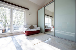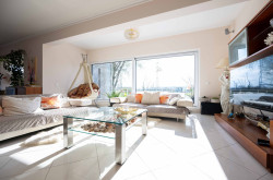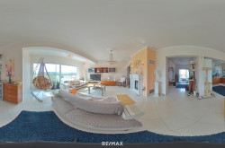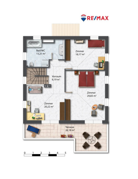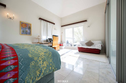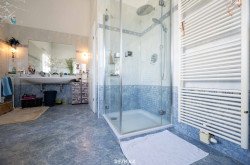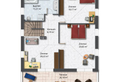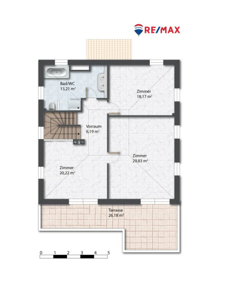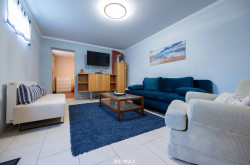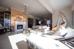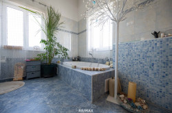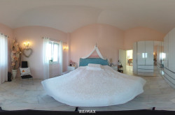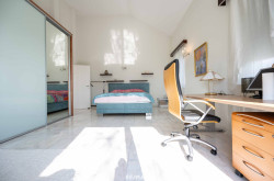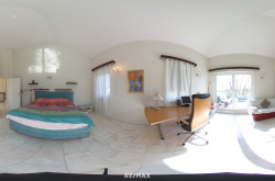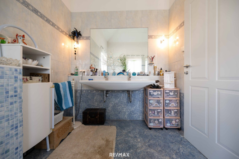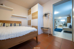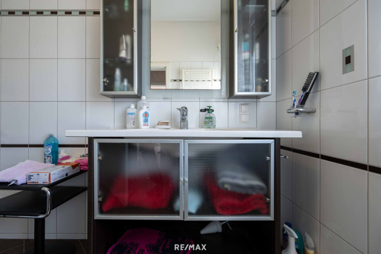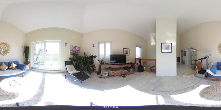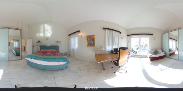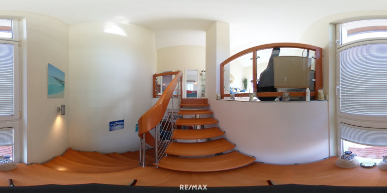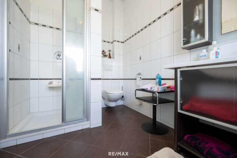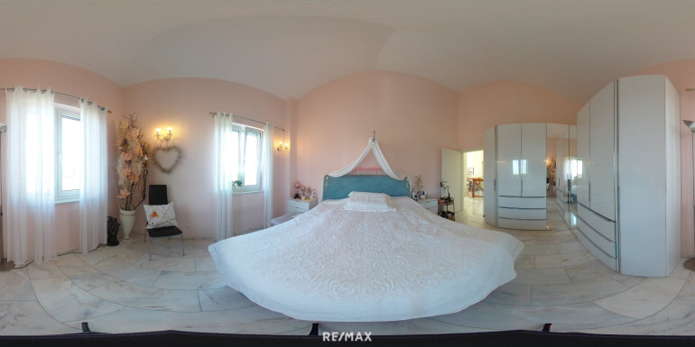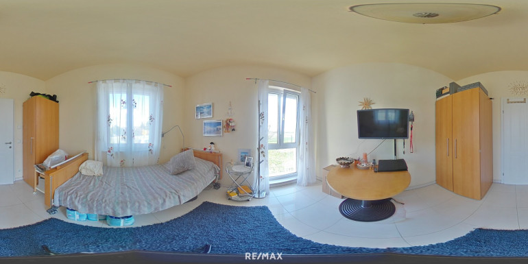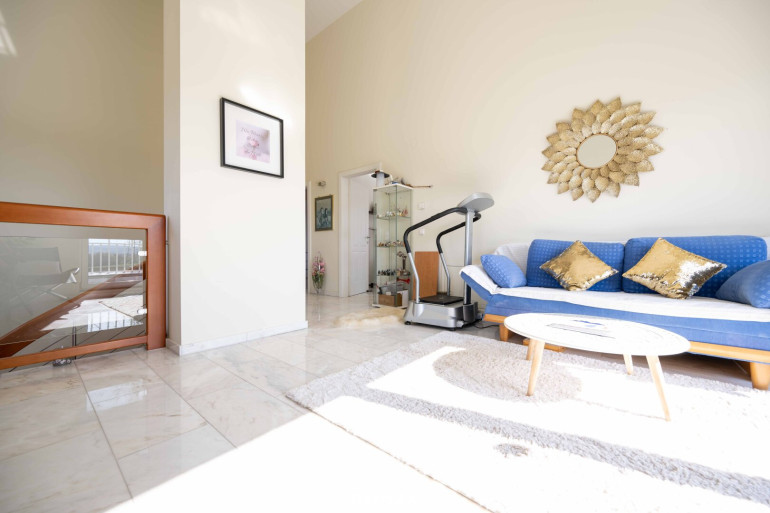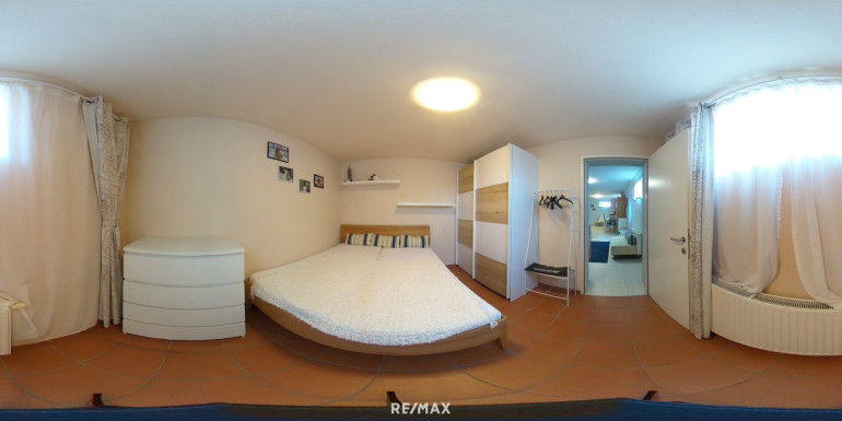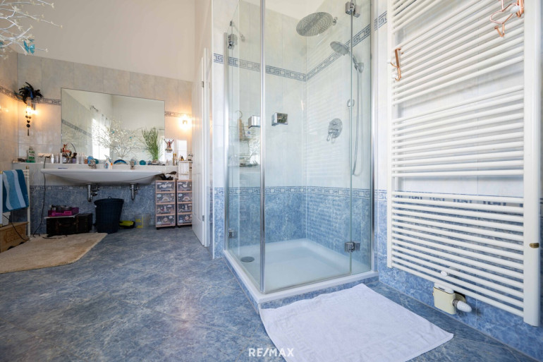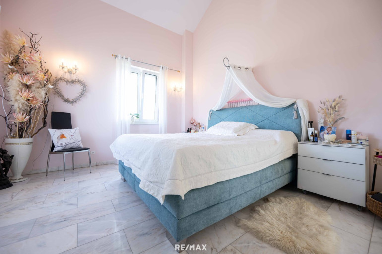 Im Obergeschoß befindet sich ein kleineres Wohnzimmer mit direktem Zugang zur oberen Terrasse, 2 Schlafzimmern sowie ein großzügiges Wohlfühlbad mit Doppelwaschbecken, Dusche und Whirlpool.