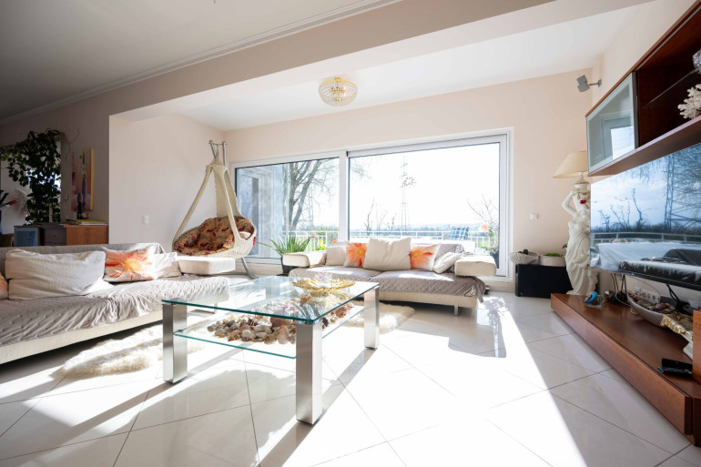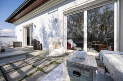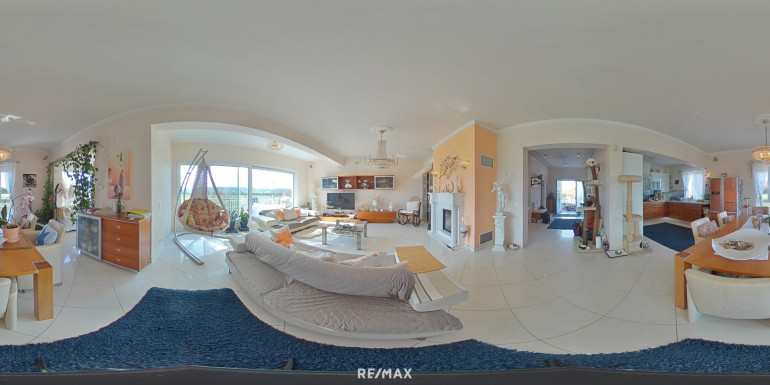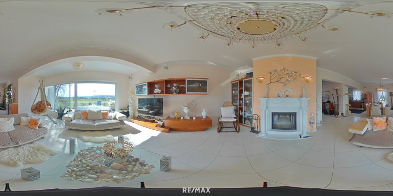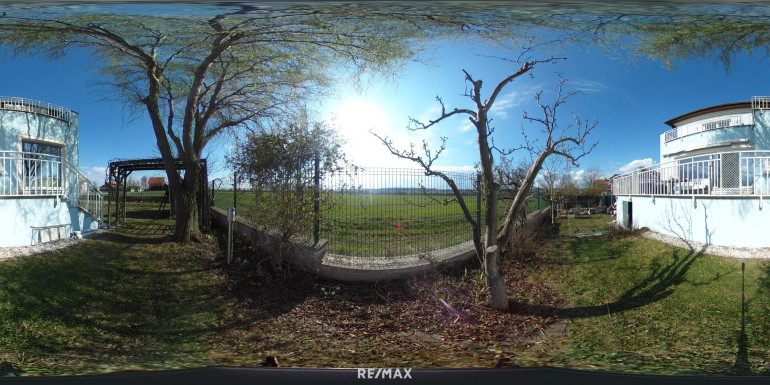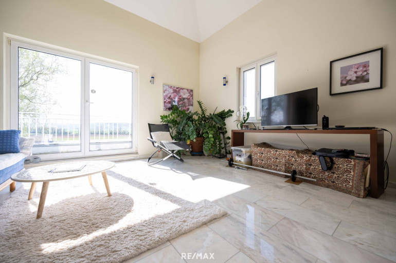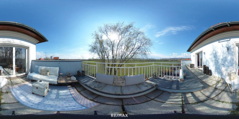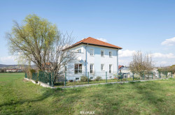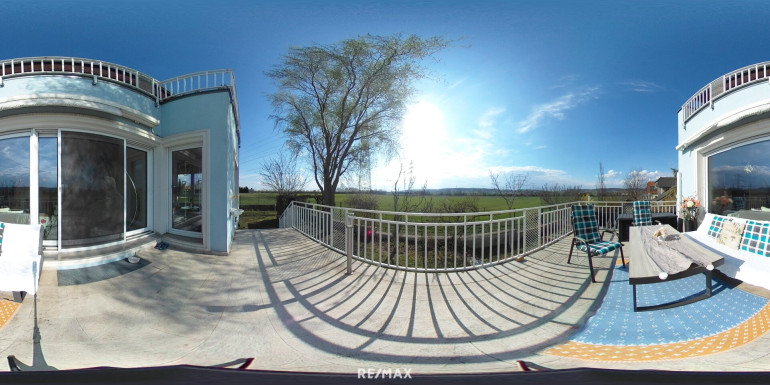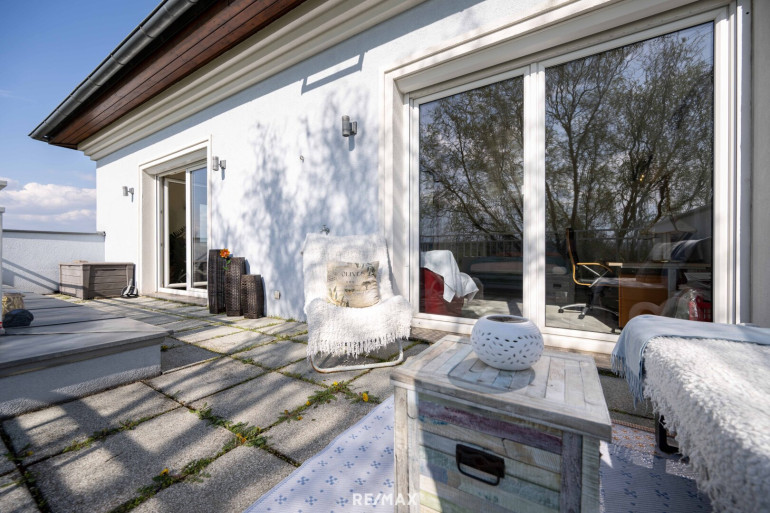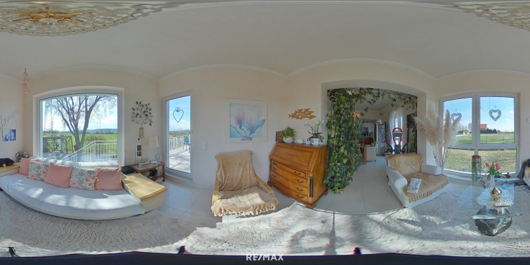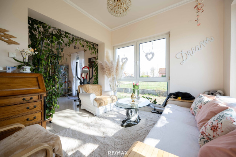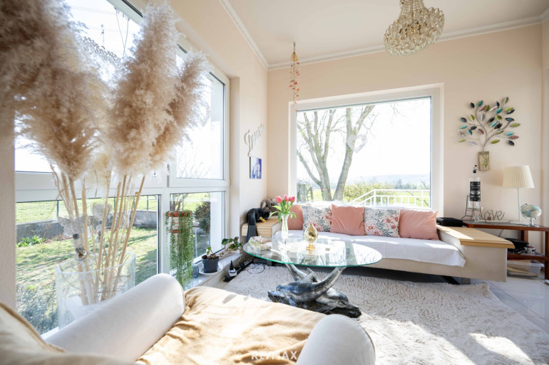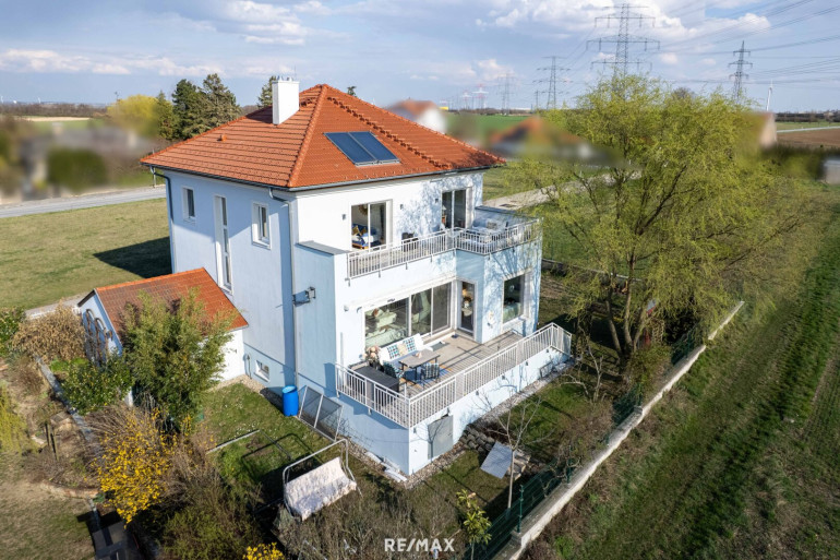 Das Herzstück bilden das sehr große Wohnzimmer mit Kamin und die moderne Designerküche, die sowohl optisch als auch funktional höchsten Ansprüchen gerecht wird. Der sonnige Wintergarten bietet direkten Zugang zu der Terrasse und über eine Treppe in den Garten. Es eröffnet sich ein herrlicher Blick über die weiten Felder des Weinviertels. Hier genießen Sie absolute Ruhe und Natur – morgens werden Sie sogar von Rehen begrüßt.
