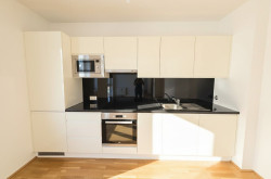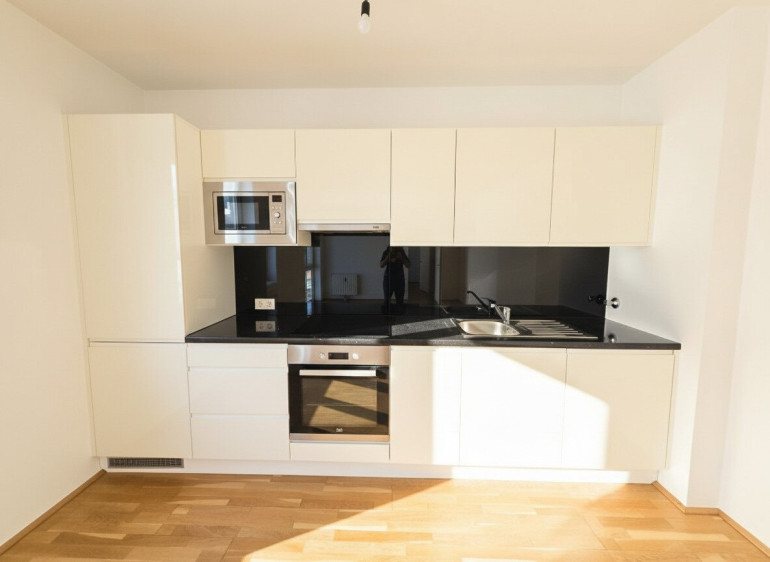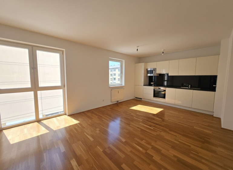 Herzstück der Wohnung ist die großzügige, rund 25,10 m² große Wohnküche. Ein bodentiefes Fenster sorgt hier für besonders viel Tageslicht und eine angenehme Wohnatmosphäre. Die moderne Einbauküche überzeugt nicht nur optisch mit ihren beige glänzenden Fronten und der eleganten schwarzen Arbeitsfläche samt Rückwand, sondern auch funktional durch ihre hochwertige Ausstattung: E-Herd mit Backrohr, Dunstabzug, Einbaumikrowelle, Geschirrspüler, Abwasch sowie eine Kühl-Gefrierkombination. Zahlreiche Stauraum- und Ablageflächen runden das Angebot ab.