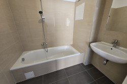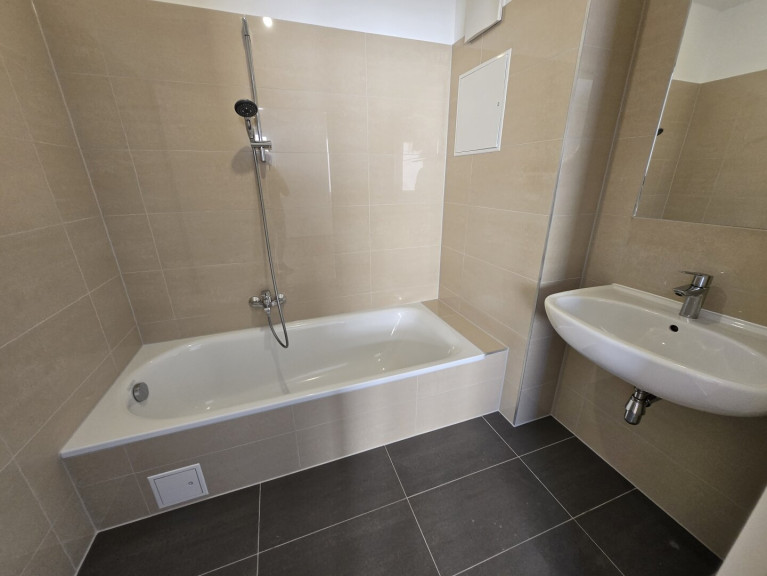 Das Schlafzimmer bietet ausreichend Platz für individuelle Gestaltungsmöglichkeiten und direkten Zugang zum Badezimmer. Dieses ist mit einer Badewanne, einem Handwaschbecken samt flächenbündigem Spiegel sowie einem Waschmaschinenanschluss ausgestattet.