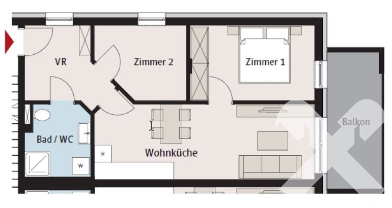 Vorraum, Badezimmer mit Wc, Wohnküche mit Einbauküche, Zimmer, Schlafzimmer, großer Balkon