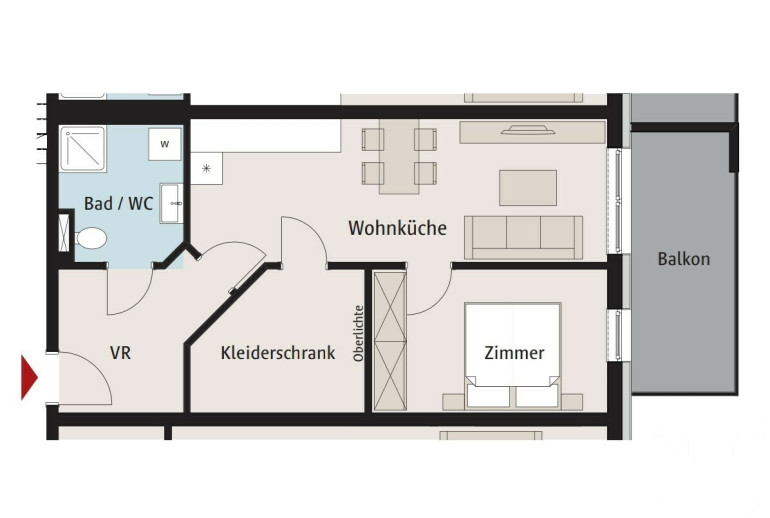 Vorraum, Badezimmer mit WC, Schrankraum, Schlafzimmer mit Zugang auf die Terrasse, offener Wohn-/Essbereich mit Einbauküche und ebenfalls Zugang auf die Terrasse.