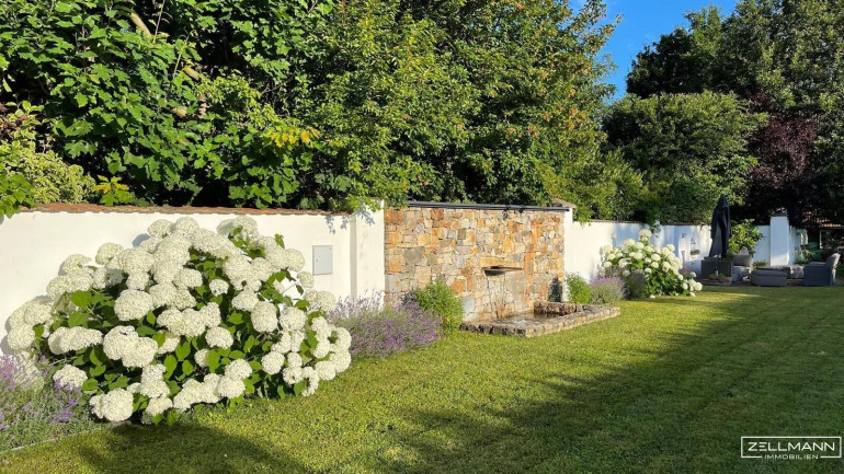 Der großzügige Garten mit stilvoll angelegten Beeten und einem Pool schafft eine besondere Atmosphäre und macht diese Immobilie zu einem echten Refugium im Grünen.