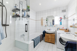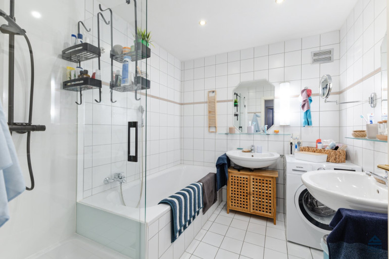 Die Kombination aus gepflegter Wohnumgebung und großzügigem Raumkonzept - verfügt doch das Wohnzimmer über eine Fläche von ca. 30 m² und das Schlafzimmer sogar über ca. 35 m² - ermöglicht komfortables Wohnen und individuelle Gestaltungsmöglichkeiten. Der Vorraum ist bereits mit mehrteiligen Schrankelementen eingerichtet, ideal als Stauraum, und bietet auch ausreichend Platz für die Garderobe. In dem vom Wohnzimmer separierte Kochbereich mit Einbauküche (samt Geräten inkl. Geschirrspüler und Waschmaschinen-Anschluss) findet auch ein gemütlicher Essbereich Platz. Durch den Zwischenflur begehbar, befindet sich das Schlafzimmer von äußerst ansprechender Größe. Durchdacht und praktisch gestaltet, präsentiert sich das Bad, das mit einer geräumigen Dusche und einer Badewanne sowie zwei Waschbecken und einen weiteren Waschmaschinen-Anschluss ausgestattet ist. Das WC samt Handwaschbecken ist separat angeordnet.